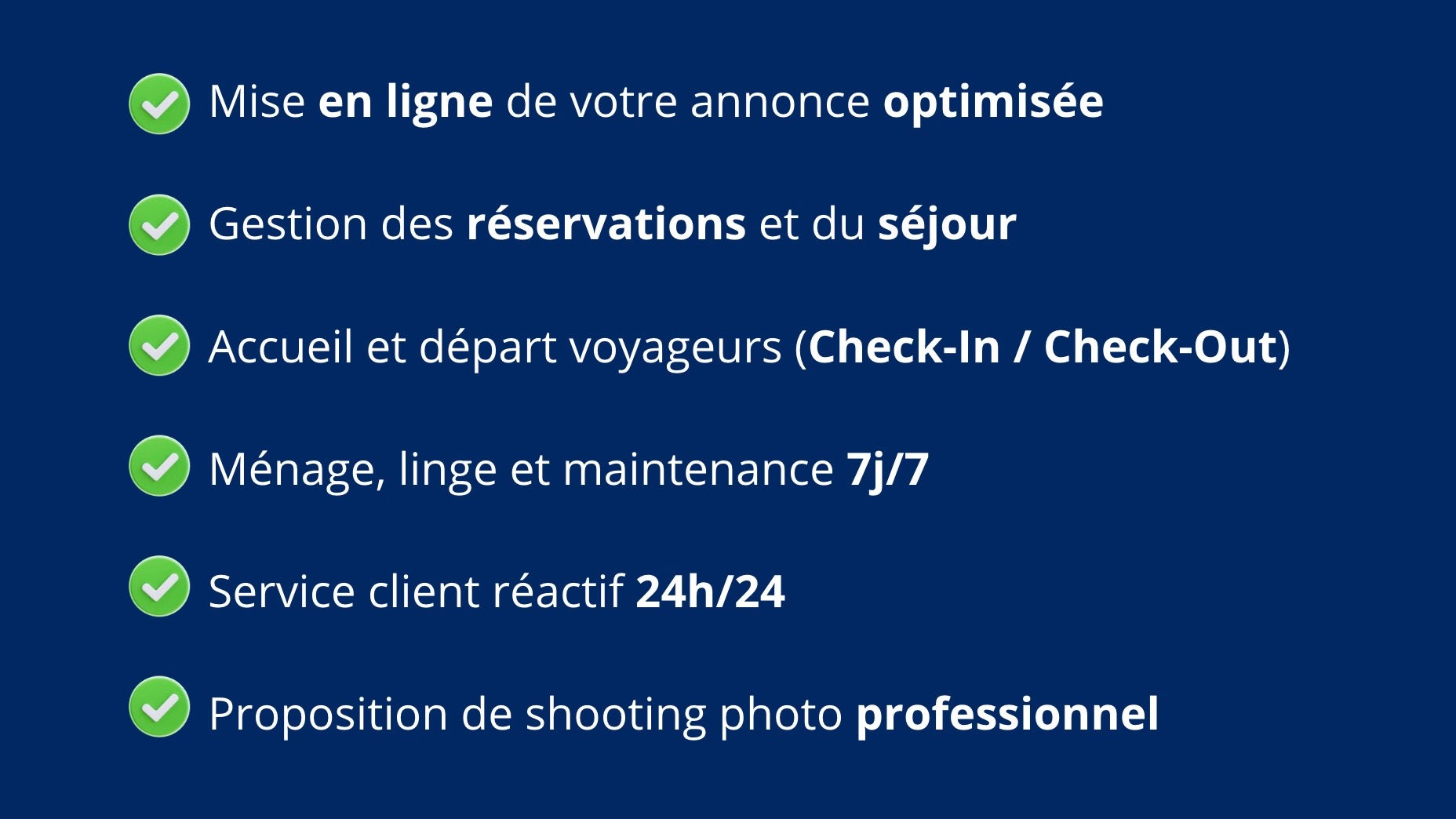 Création/optimisation d’annonce, gestion des réservations, Check-In / Check-Out, assistance voyageurs 24/7, coordination ménage/linge, suivi du séjour.